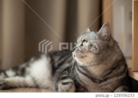 Beautiful grey cat lies and looks away