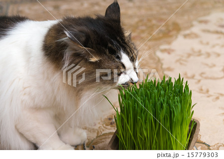 おぉ新鮮だにゃあ。種からどっさり。猫と猫草、ペット草、燕麦、エン麦、オーツ麦、ペット、イメージ素材