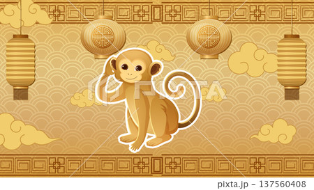 Chinese Zodiac Monkey Illustration with Traditional Lanterns and Golden Background