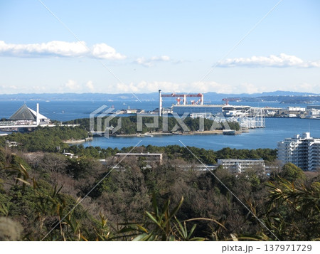 横浜市金沢区の称名寺市民の森にある八角堂広場(金沢山山頂)からの眺め(南東側 八景島・猿島方向)