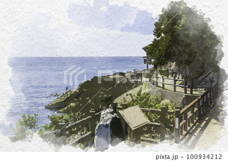 水彩画風 鬼ヶ城 魔見ヶ島 三重県熊野市