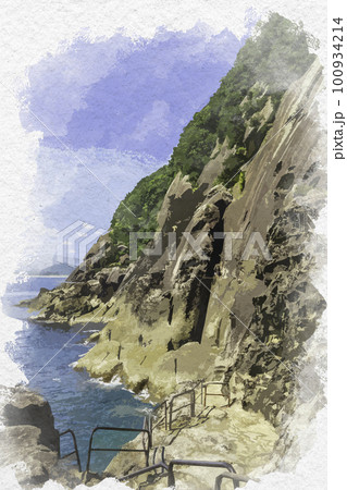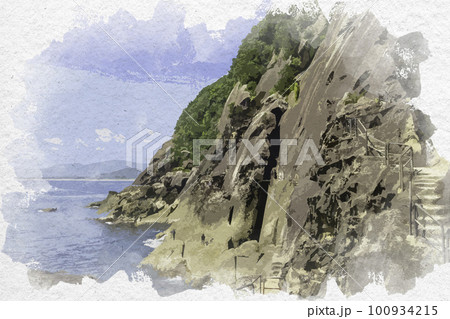 水彩画風 鬼ヶ城 断崖 三重県熊野市