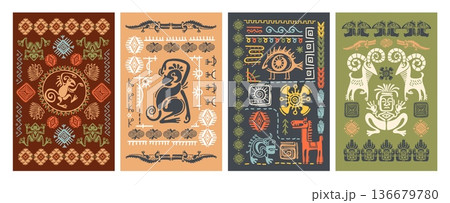 Aztec inca tribal patterns. Ancient ornaments, maya civilization culture, ethnic silhouetted elements, geometric borders and stylized animal motifs mexican culture, splendid vector isolated set