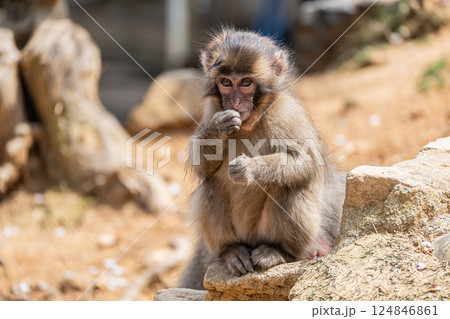 池の傍にすわるニホンザル 嵐山モンキーパークいわたやま