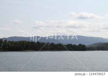 夏の天橋立から天橋立ビューランドと玄妙庵を臨む