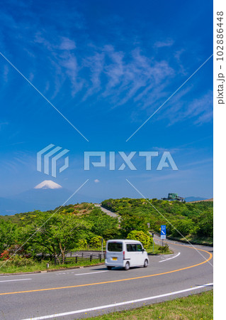 (静岡県)ツツジ咲く伊豆スカイラインを走る車と富士山