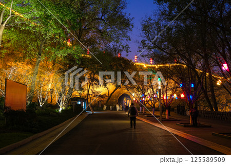 中国 南京市、夜の玄武湖公園 ライトアップされた城壁