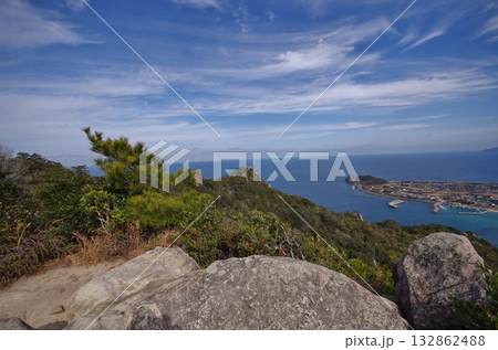 佐賀県唐津市 鏡山展望台から眺める唐津城と唐津湾と虹の松原