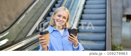 Portrait of smiling, beautiful young woman with smartphone, standing on bottom of escalator, giving you cup of coffee, brought takeaway