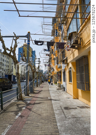 Shanghai, China - 1 April 2025: Traditional yellow apartments with laundry racks in Pudong. Pedestrians, trimmed trees, and a glass skyscraper under clear sky.