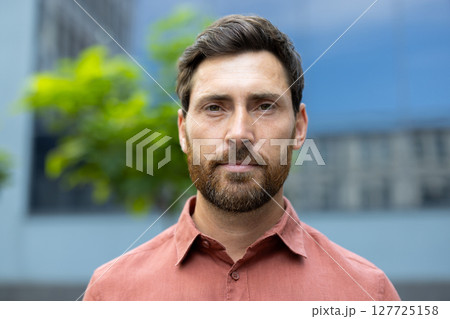 Portrait of serious confident man outside office building. Close-up businessman in red shirt looking at camera. Company employee thinking and focused.