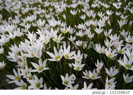 公園に白いタマスダレの花が咲いています。学名はZephyranthes candidaです。