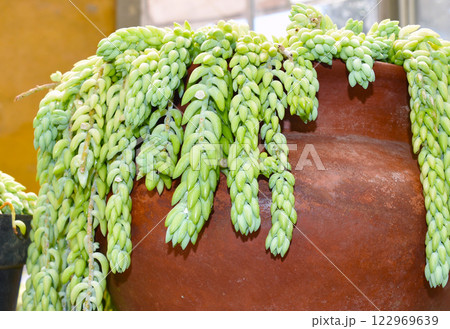 陶器の壺に入ったサボテン セダム「玉つづり」