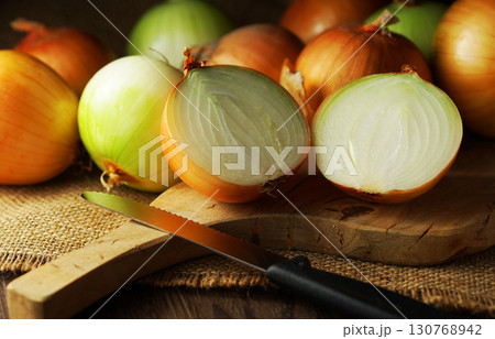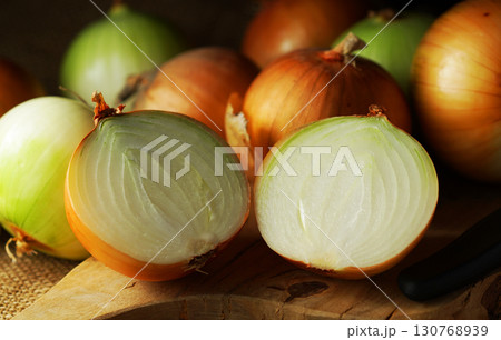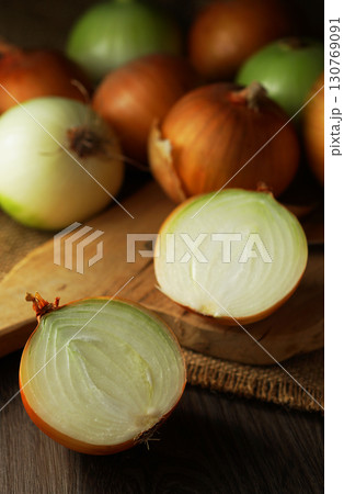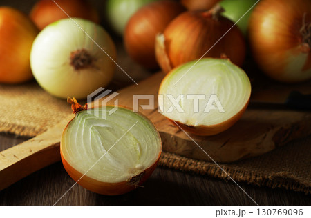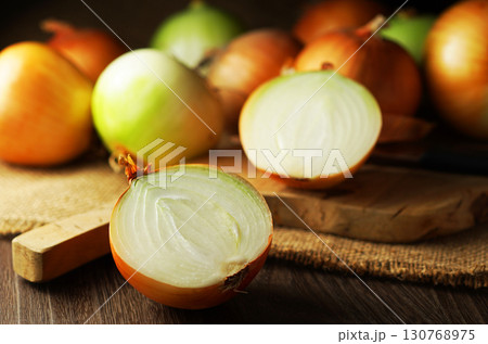 半分にカットされた玉ねぎとたくさんの玉ネギ