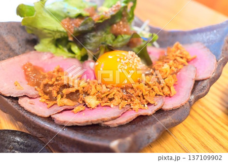卵黄とフライドオニオンをのせたローストビーフ