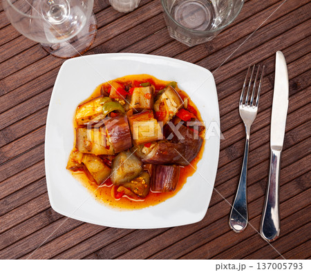 Appetizing stewed eggplant with onions and gravy