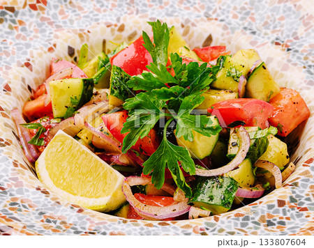 Fresh vegetable salad with herbs and lime juice served in a decorative bowl