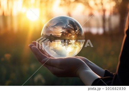 自然が映る水晶玉を持つ女性の手