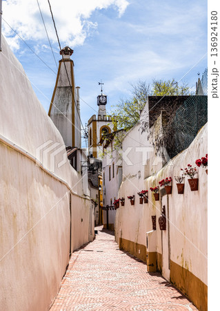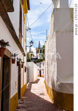 Beautiful narrow cobblestone Rua de Santa Maria street in the traditional village of Nisa, in Alentejo, Portugal