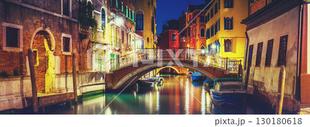 Venice street at night, bridge over canal, Venice, Italy. Horizontal banner