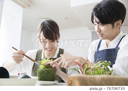 コケ玉作りを楽しむ日本人の若い夫婦、ガーデニング、趣味