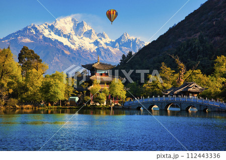 麗江古城の黒龍潭公園より見た玉龍雪山