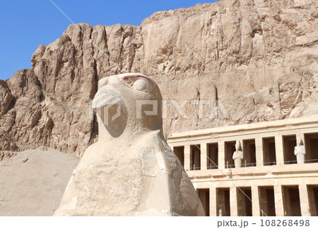 Statue of falcon or Horus statue at entrance of Deir el-Bahari (Deir el-Bahri) the Mortuary Temple of Hatshepsut in Valley of the Kings, Western Thebes, Luxor, Egypt