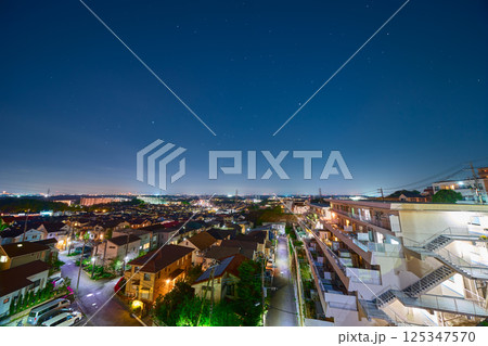 春の神奈川県川崎市麻生区の王禅寺見晴し公園から西側の超広角夜景眺望(王禅寺西,白山,沈むオリオン座等