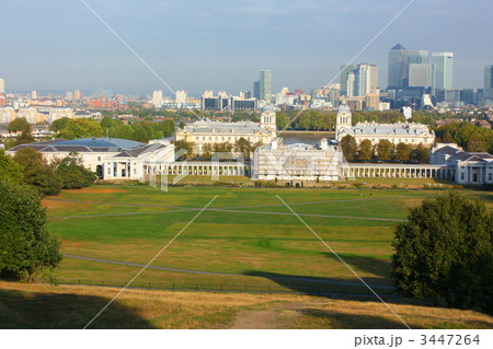 イギリスロンドン 世界遺産マリタイムグリニッジの旧王立海軍学校と夕焼けのビル群