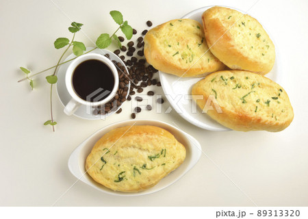 濃咖啡和烤好的大蒜麵包