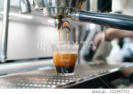 Fresh Espresso Shot Pouring from Coffee Machine in Cafe