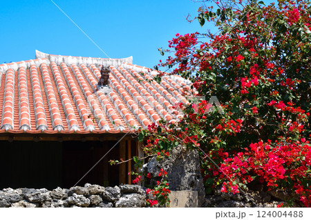 沖縄竹富島 琉球瓦の民家とハイビスカス
