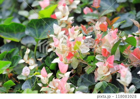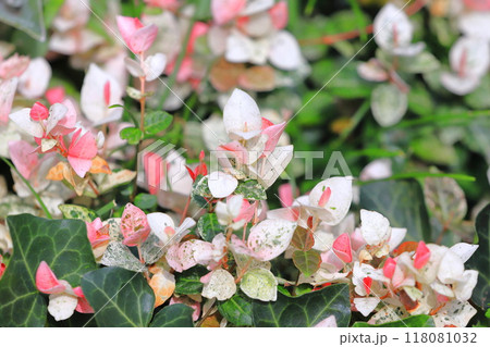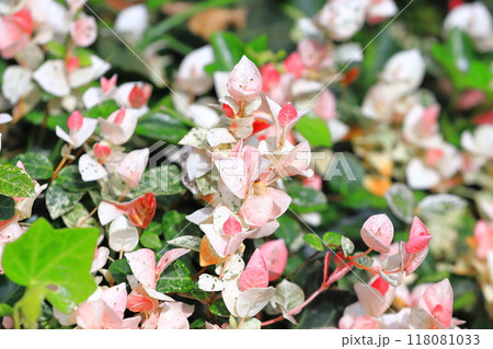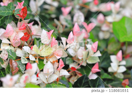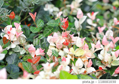 赤とピンク色の葉が混じったハツユキカズラ(初雪葛)
