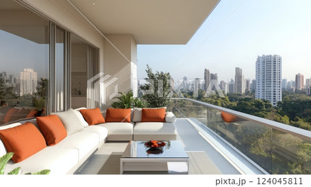 The spacious balcony features a stylish outdoor seating area adorned with orange cushions, providing comfort while overlooking a bustling city skyline under clear blue skies.