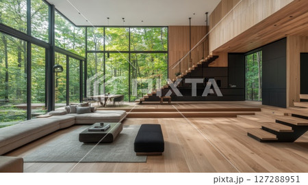 Modern Living Room with Floor-to-Ceiling Windows and Wooden Staircase