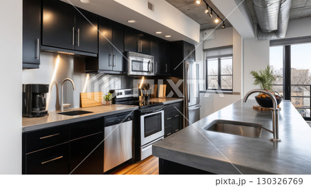 Modern Kitchen with City Skyline View and Stainless Steel Appliances