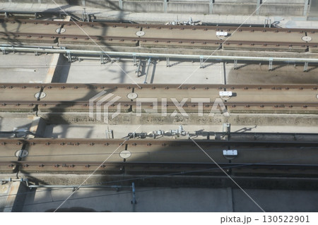 モノクローム風景、夏空と公園の木々、高架橋の陰、
