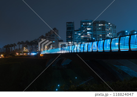 Bridge with a blue light shining on it, Miraflores, Lima Peru. VILLENA REY BRIDGE