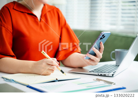 businesswoman hand writing on the notepad with new modern computer strategy diagram as concept