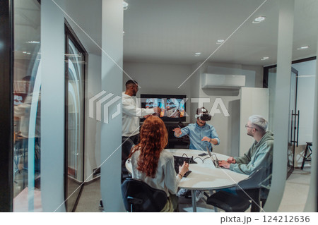 A diverse group of businessmen collaborates and tests a new virtual reality technology, wearing virtual glasses, showcasing innovation and creativity in their futuristic workspace