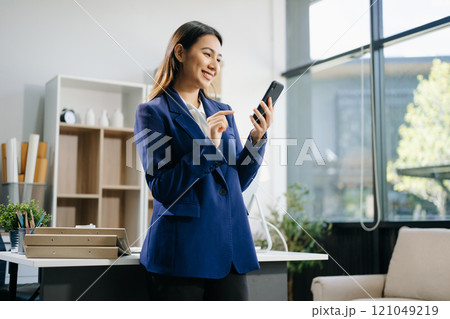 Asian businesswoman office worker holding a pen under chain looking at laptop on table in white room