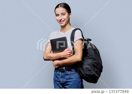 Portrait of beautiful female teenage student with backpack, laptop on gray background
