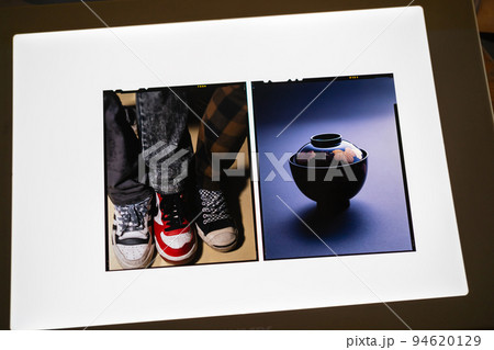 ブローニーのポジフィルム(67)を現像したあとライトボックスで鑑賞する