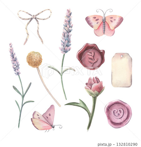 Botanical set, lavender, butterflies, peony bud, wax seal, blank tag, string bow. Hand-painted watercolor illustration, elements isolated on white for floral, wedding design, invitations, branding