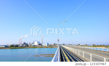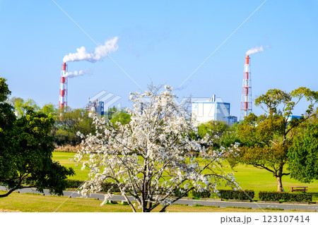広場から観える製紙工場の煙突風景 遙拝八の字広場「はくはいはちのじひろば」熊本県八代市渡町