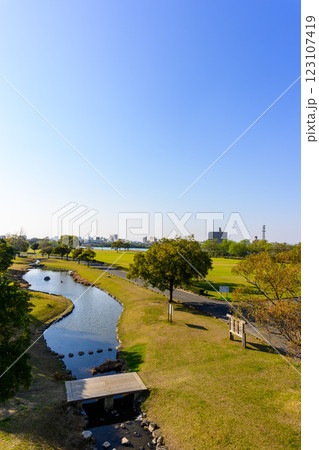 青空を背景に映える 球磨川河川緑地・球磨川河川敷芝生広場から観える風景 (八代市)