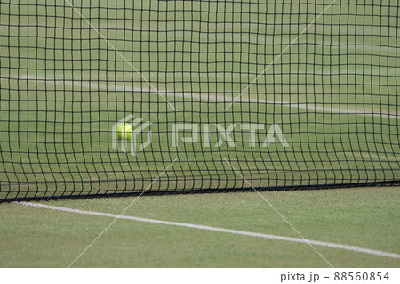 硬式テニスの試合中のテニスコートのネットとテニスボール