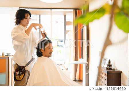 ヘアカットをする男性スタイリストと男性客 ヘアサロン イメージ