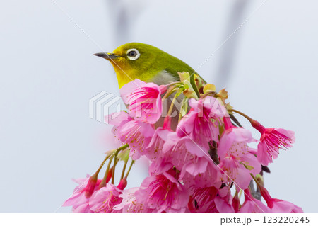 沖縄県名護市名護城公園さくらの園 南西諸島に生息する枝を飛び回るリュウキュウメジロと早咲き琉球寒緋桜