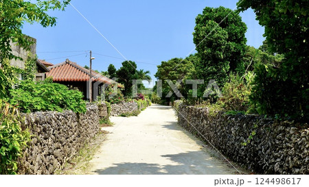 沖縄 石垣に囲まれた赤瓦屋根と白砂の道とブーゲンビレア